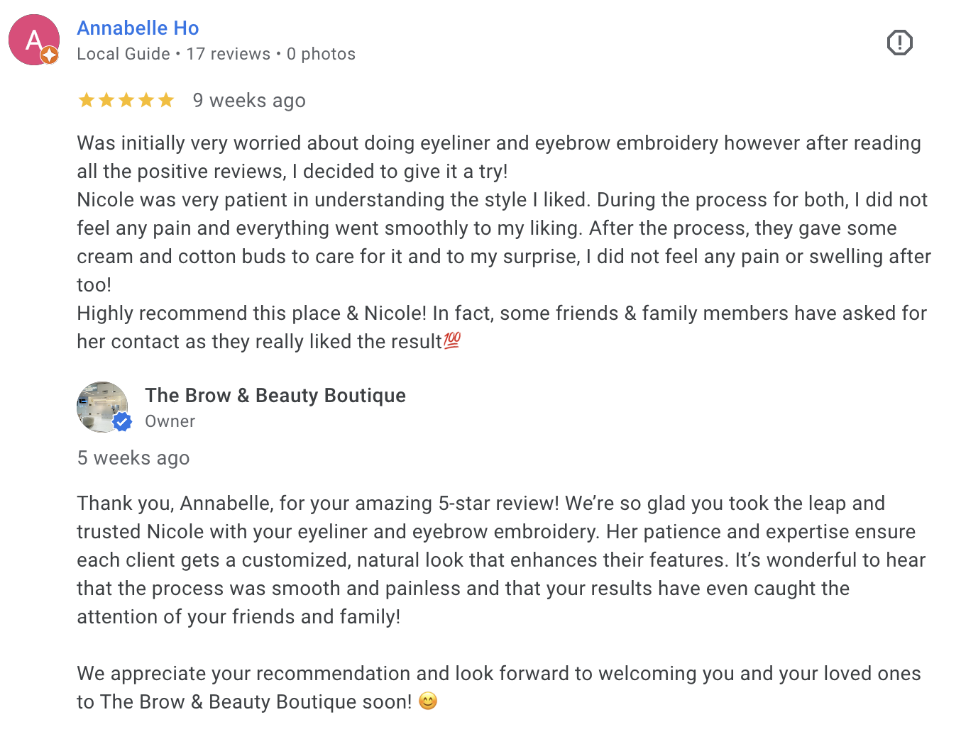 Annabelle highly recommends The Brow & Beauty Boutique and Nicole for anyone looking for a professional, comfortable, and flawless eyebrow and eyeliner embroidery experience.