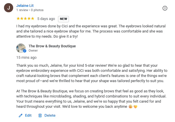 For Jelaine Lit, the goal was simple: brows that looked natural and felt like her own. What she didn’t expect was just how comfortable and personal the experience would be at The Brow & Beauty Boutique.