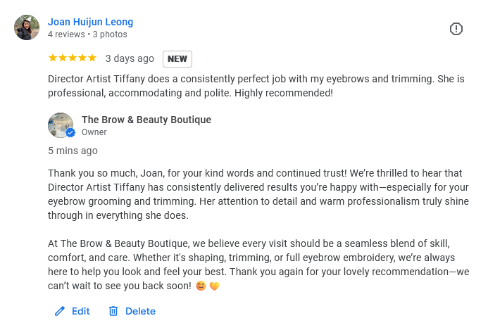 Joan Huijun Leong has been coming back for a reason. For her, there’s simply no one better than Director Artist Tiffany when it comes to eyebrow grooming and trimming. With every visit, Tiffany delivers the same thing: flawless brows and a warm, welcoming experience that feels just as personal as it is professional.