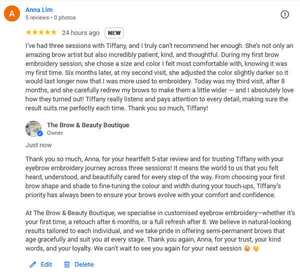 For Anna Lim, eyebrow embroidery wasn’t a one-time decision—it was a carefully paced journey across three sessions, guided by the steady hands and heart of Director Tiffany at The Brow & Beauty Boutique.